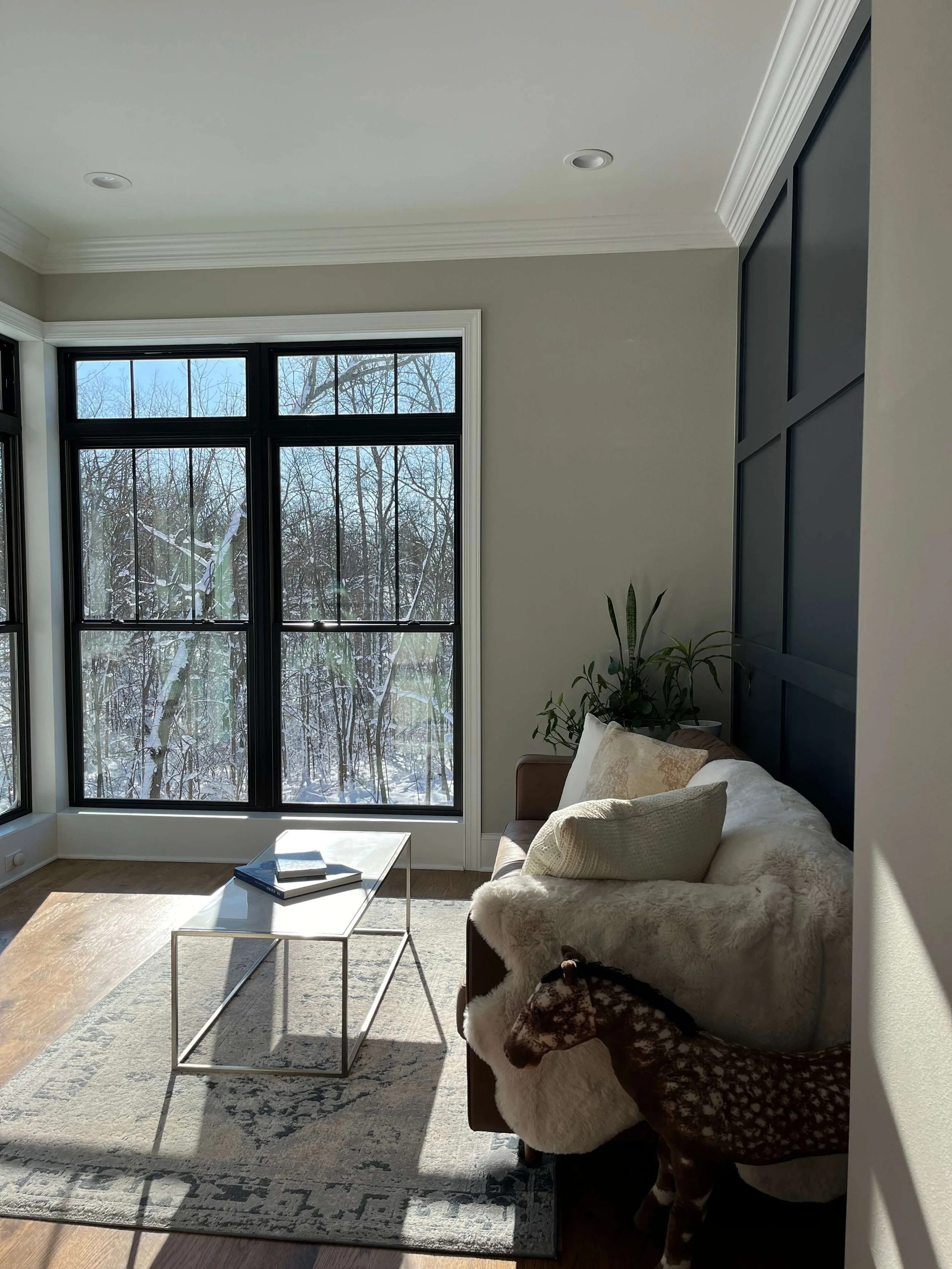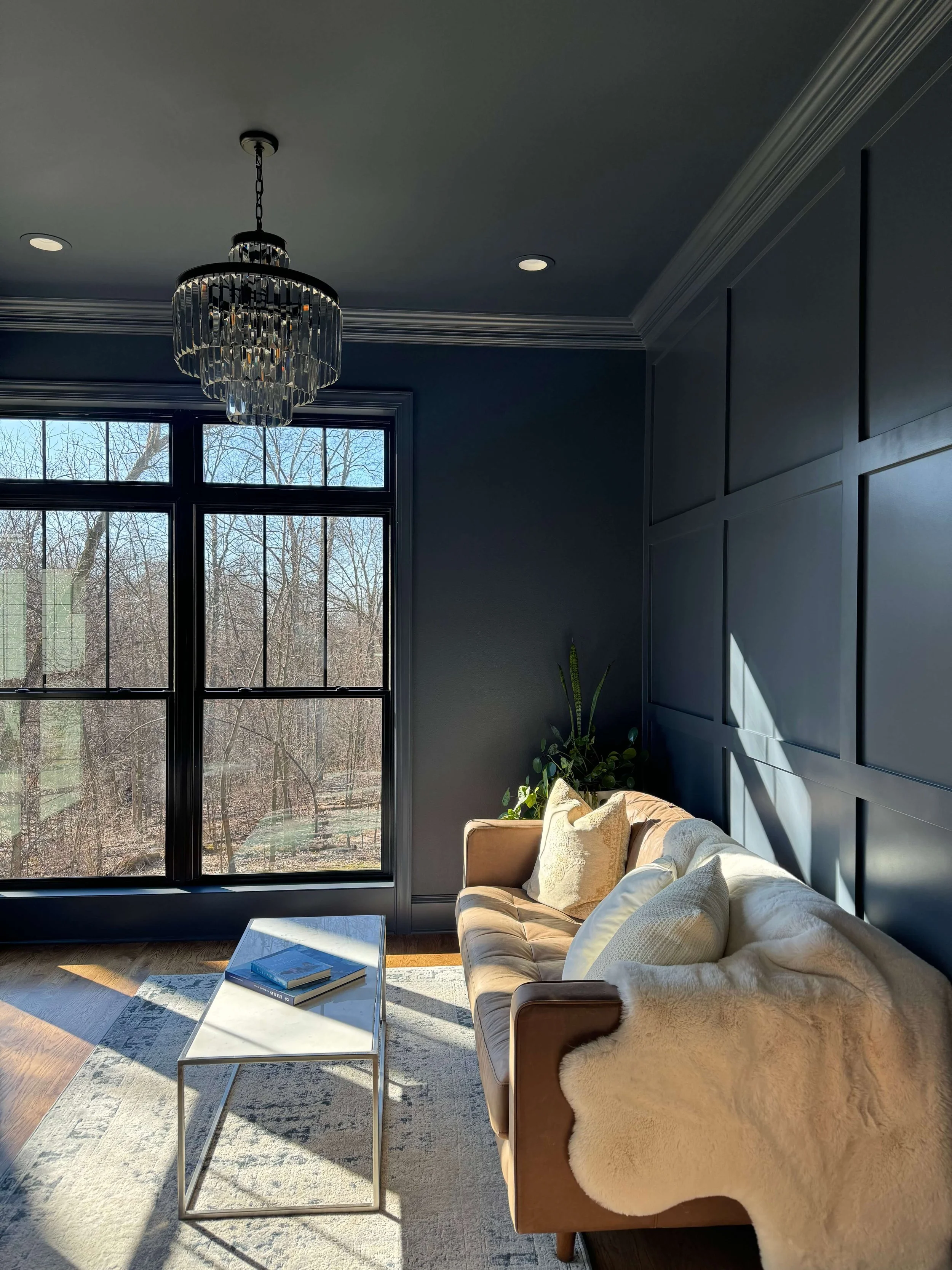 Adding a bit more depth to this space through paint was the goal. An all over color application to the sitting room accentuates the large windows and adds drama!