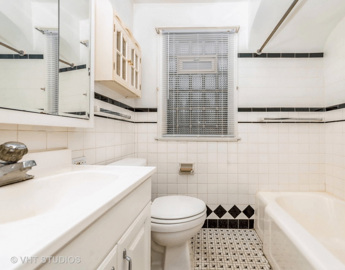 Our goal was to modernize and refresh this 1930s bathroom while maintaining the historic charm and distinctive tile work. The bold paint color added a wow factor that transformed the space from dated to renewed.